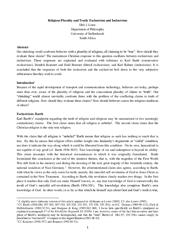 Pdf Religious Plurality And Truth Exclusivism And Inclusivism Dirk Louw Academia Edu